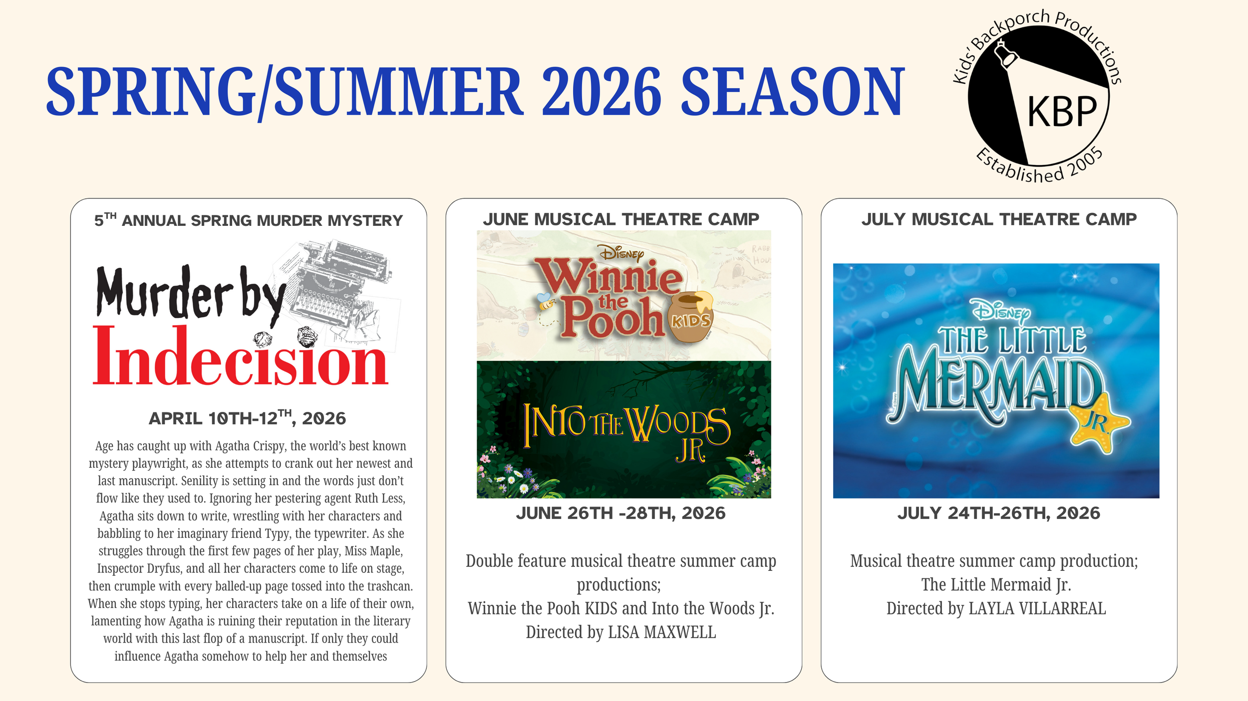 SEE OUR 'TICKETS AND PAYMENTS' TAB FOR SHOW TICKETS. SEE OUR 'REGISTER' TAB TO SIGN UP FOR CAMP OR CLASSES!